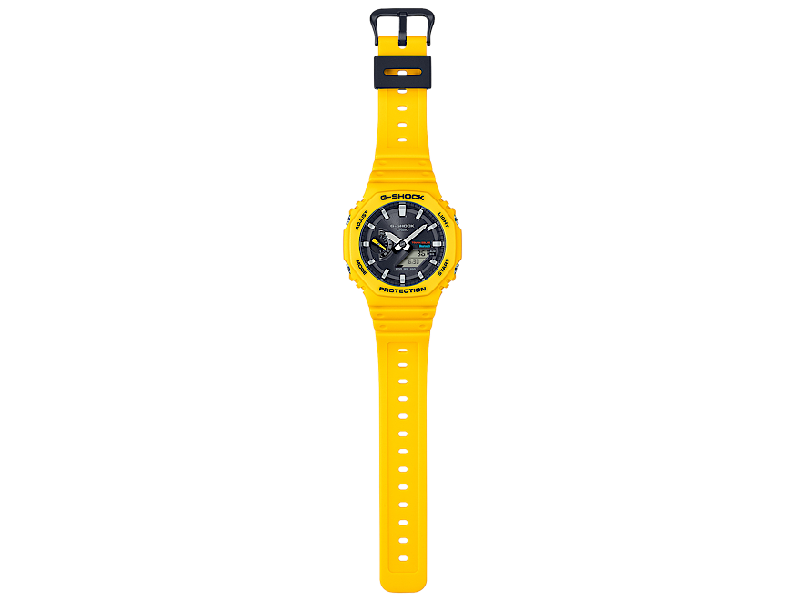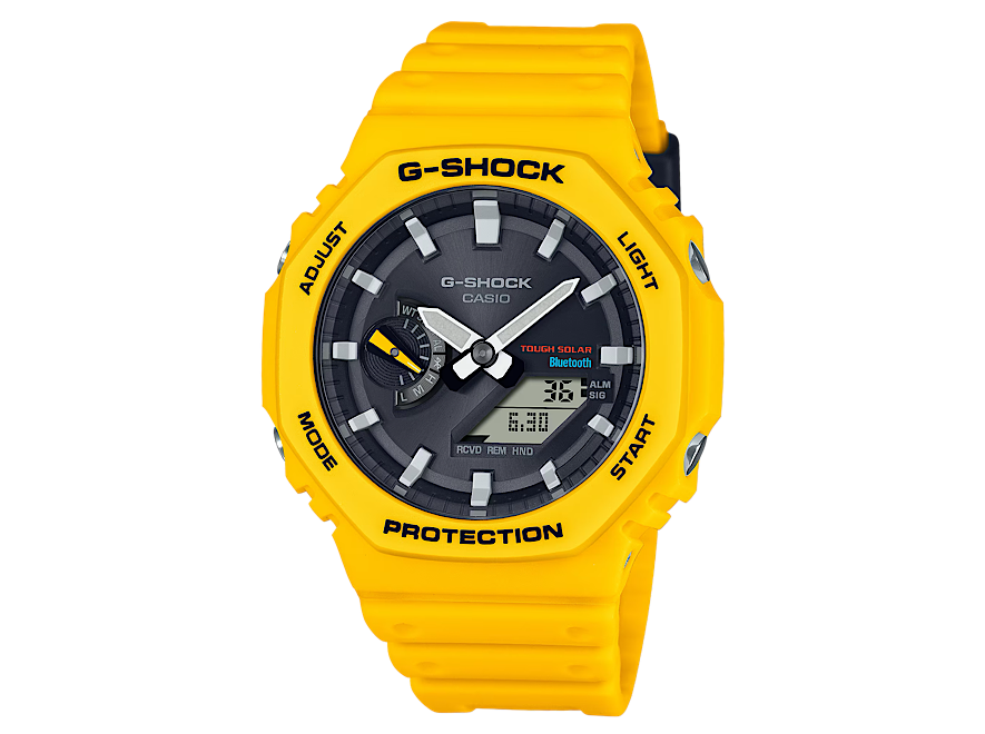 Bold, energetic, and built for the future. The G-Shock GA-B2100C-9AER features the iconic slim octagonal case paired with a striking yellow resin strap for standout street style. Upgraded with Bluetooth connectivity and Tough Solar charging, it delivers legendary G-Shock durability with modern smart functionality. Shock resistance, 200-meter water protection, and dual analog-digital display make it ready for everyday wear.